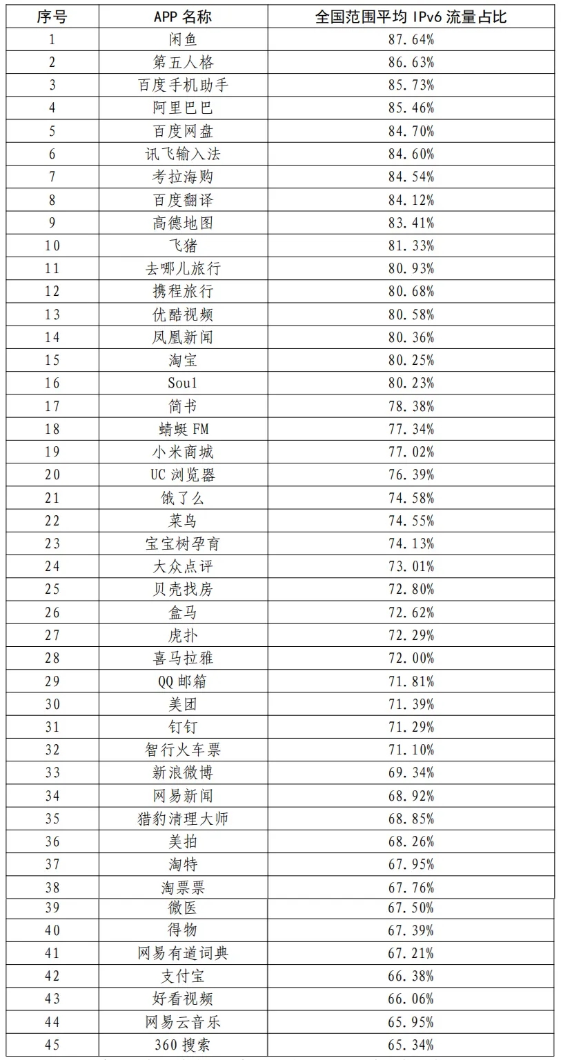 截至2021年10月,納入監(jiān)測范圍的200款A(yù)PP均支持IPv6訪問,IPv6流量平均占比達(dá)39.77%,其中已有45款A(yù)PP的IPv6流量占比超過65%,名單如下: